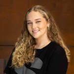 Photo of a women with long wavy blonde hair wearing a black t-shirt