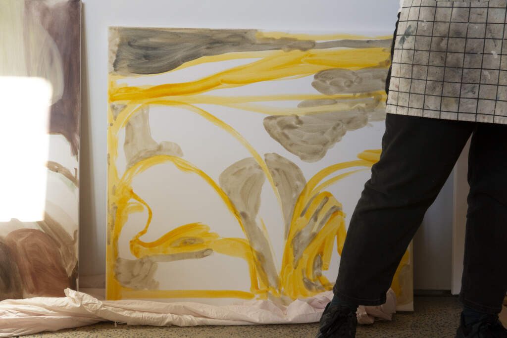 AK: Yes. This is a very initial, like, ground making, really loose. I just wanted to do something when I was here. So, I stretched these up, which can be a bit of a labour of love thing. And after, I just really wanted to get some paint on them. At this point I'm just playing around, what’s there will probably form some kind of aspect of the composition, but I think they'll probably go somewhere very different as I continue to work on them.